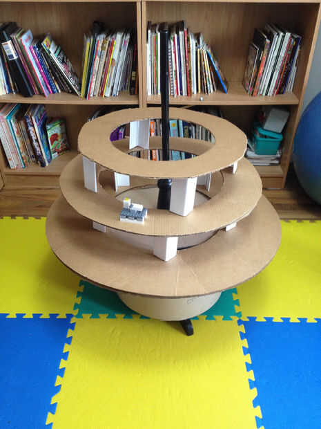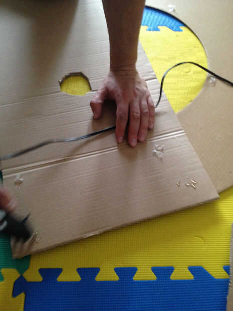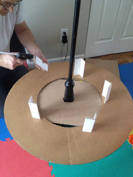 Para asegurarse que la parte inferior del círculo (círculo 1) es robusto, había pegado a un pedazo de cartón y luego pegar la cartulina sobre el soporte base. Desde entonces, pegado a las piernas en cada círculos y apilarlos.
