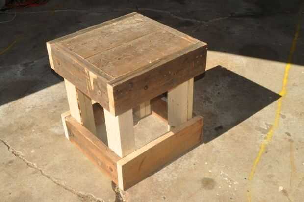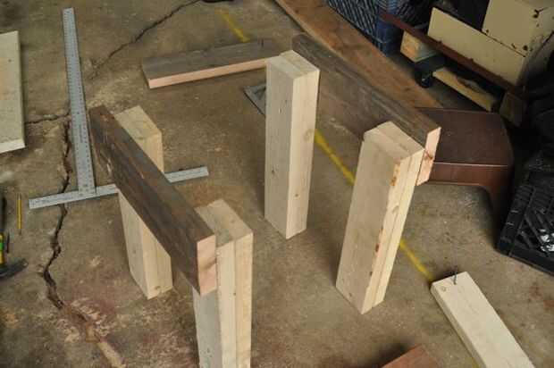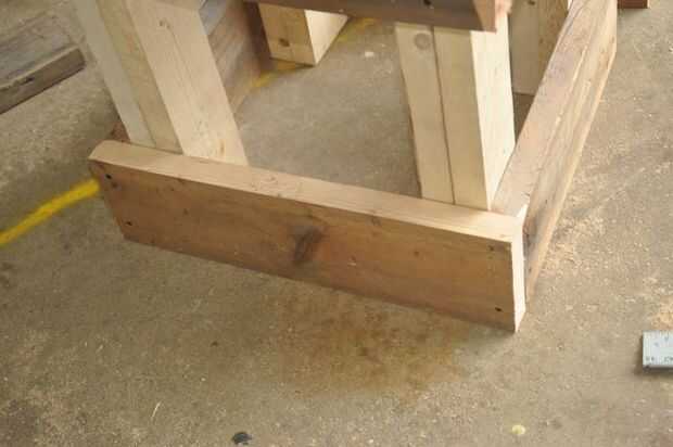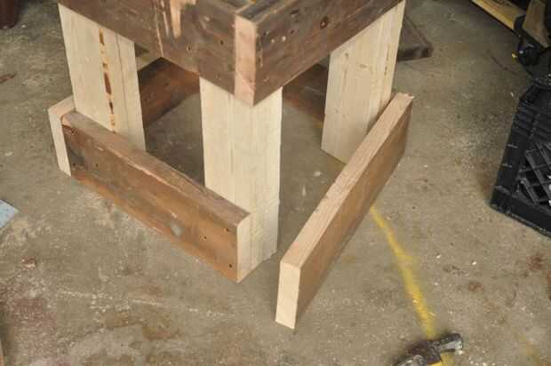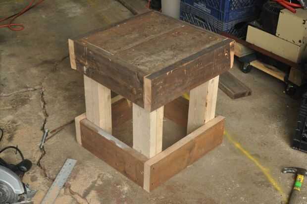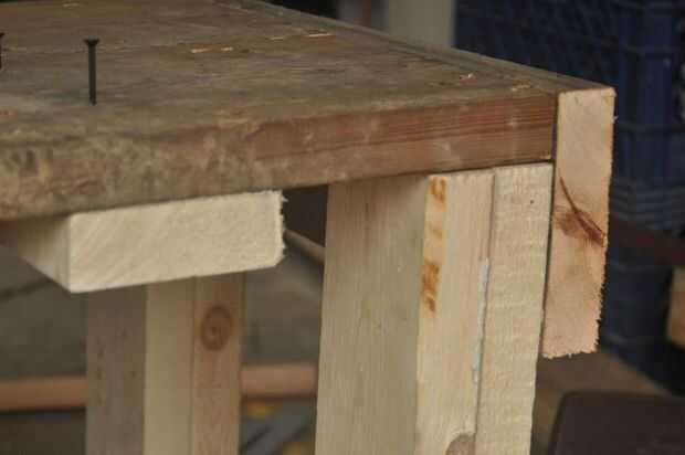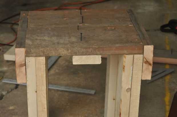 Me quedé hasta las cuatro patas. Luego viró juntos el dos 2x10s temporalmente por lo que puede colocarse directamente sobre las piernas. Puse un tornillo de la cubierta por la parte superior de cada esquina de la parte superior en las piernas.