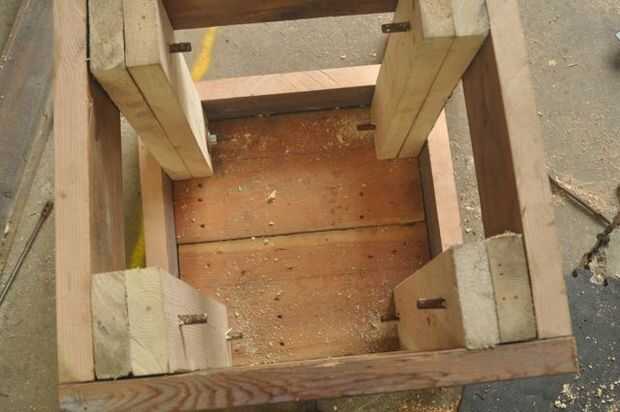 A continuación, instala las otras cuatro piezas de 2 x 6 alrededor de la base del soporte, comprobé para Plaza y montada con tornillos.