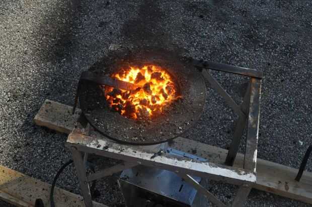 Encendió mi Fragua de carbón muy básico y me calienta la mitad de cada uno de los cuatro pedazos de hierro. (Si usted está interesado en la construcción de su propia fragua, hay muchos ejemplos aquí en Instructables.)