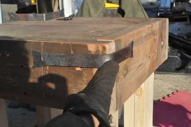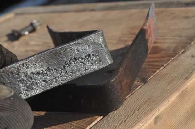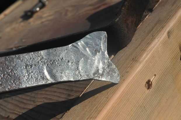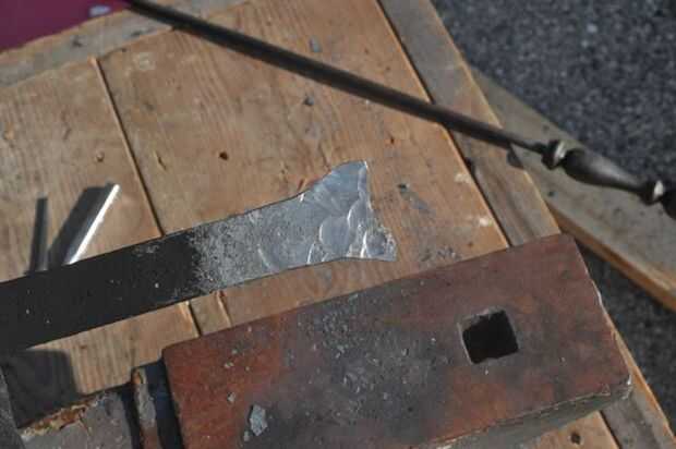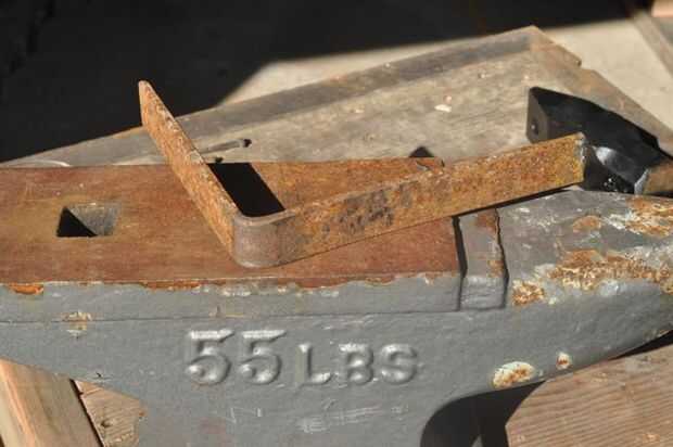 Con el metal caliente, golpearon en un ángulo recto sobre el borde del yunque.