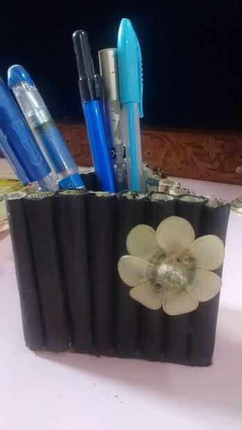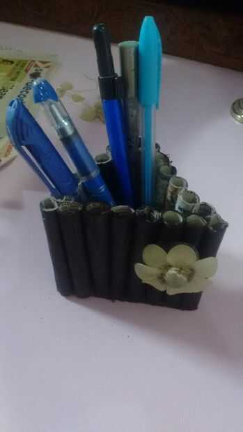 se puede realizar en cualquier forma de su elección. Hice un soporte triangular. Requisitos: Periódico, pintura negra, pincel, pegamento, cartulina, tijeras, algo para decorar (yo usé mi vieja rota granos de la pulsera)