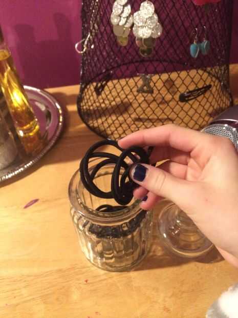estoy seguro de que usted puede imaginar, sólo puso los elásticos de pelo en la jarra y tienes un lindo poco soporte elástico de pelo! Esto también funciona con horquillas o con otros accesorios para el cabello.