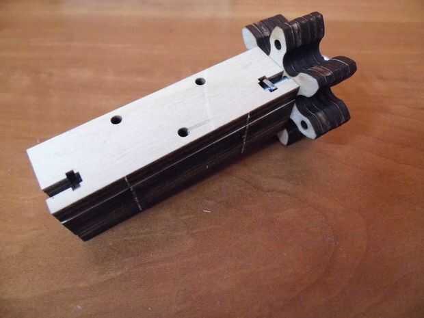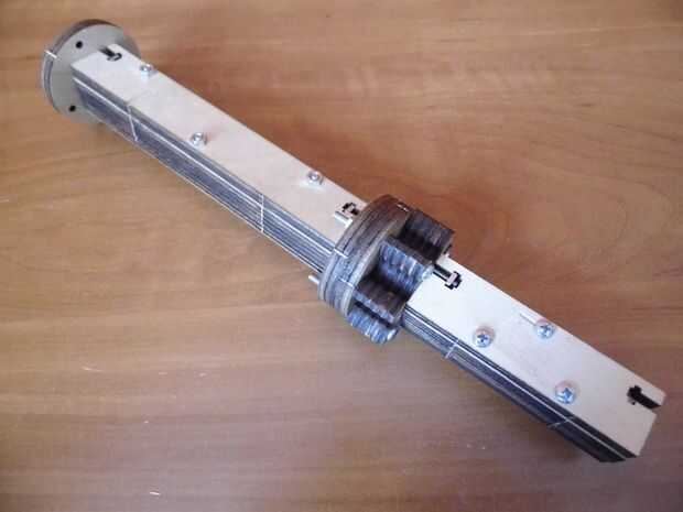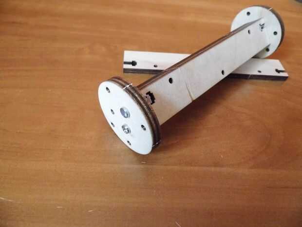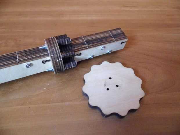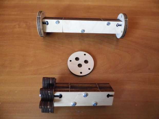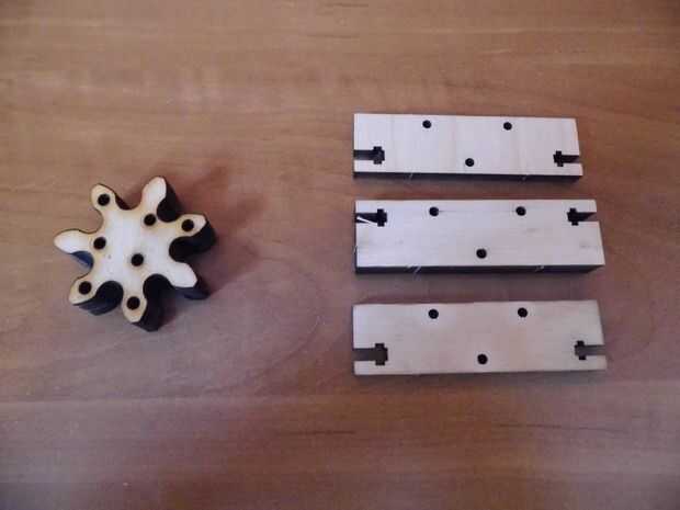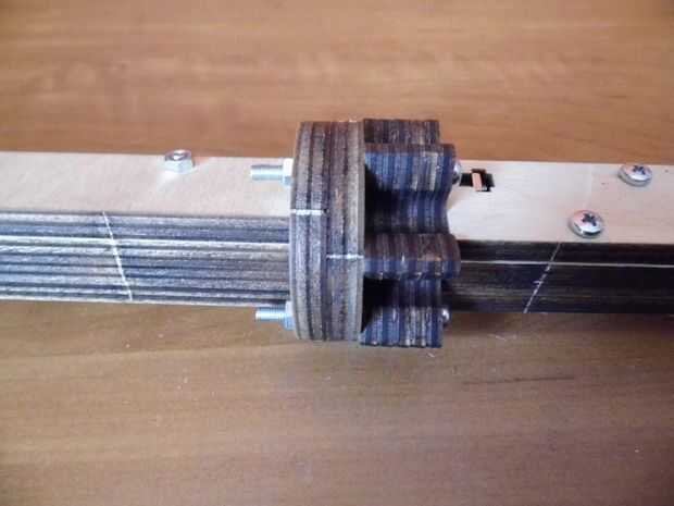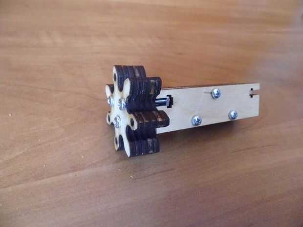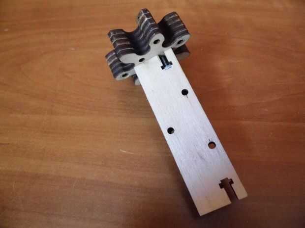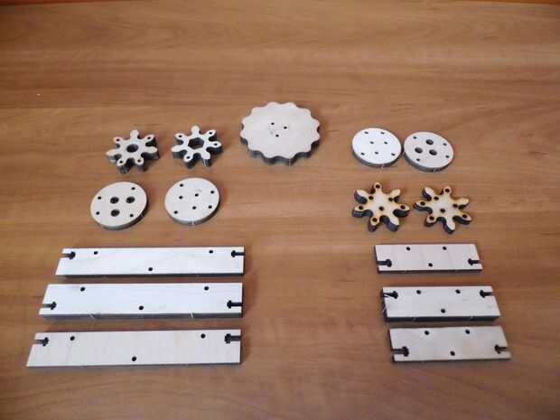 Durante el montaje los engranajes (tornillos de 35mm M3) recuerden que ambos engranajes deben estar en línea. Los engranajes delanteros (un poco más grandes, sin agujero central) van entre vigas largas y cortas. Ahora añadir rayo más corto al igual que con el más largo.