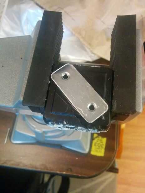 La pieza de metal por suerte tenía los agujeros que se perfora hacia fuera creando bordes de metal que salían hacia fuera alrededor del orificio de tornillo. Esto iba a ir directamente en los agujeros que había hecho para darle un asiento más sólido y le proporcionar fuerza adicional a la parte que iba a sostener el marco de la tableta. La pieza de ajuste al ras en los dos agujeros y era una cuestión de súper pegado las piezas juntas y deja toda la noche para que se seque.