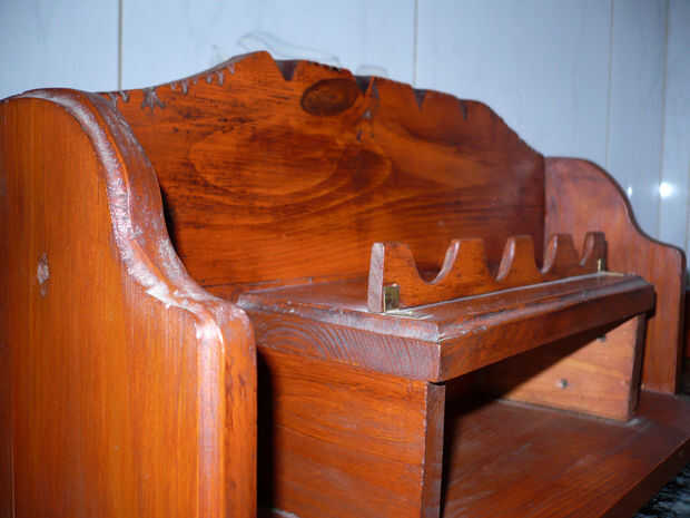 El perfil de la cara, se hace con lima redonda y el cajón, también. Pueden ser tacos de madera vistos conectar el lateral y la base. La parte superior de las pipas de tabaco, está hecho de restos de marcos de puertas y pegado y sujetado con un ángulo de latón. El bronce viene de cualquier parte de cualquier dispositivo electrónico. Lo único que se compra para este trabajo son las esquinas de latón.