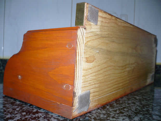 El perfil del lateral, esta hecho con lima redonda, y el de la caja del cajon, tambien. Se pueden ver las espigas de madera unen el lateral y la base. El tope de las pipas, esta hecho en restos de marcos de puertas, y encolado y Active campo sujeto con un angulo de laton. El laton seria de alguna parte electronica de cualquier aparato. Lo unico es comprado para este trabajo, son las cantoneras de laton.