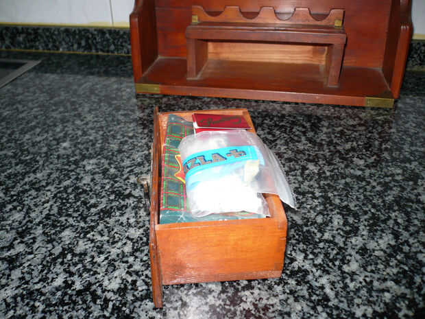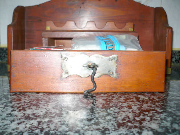 El cajon tambien esta hecho con restos de marco de puertas. El escudo del tirador esta hecho con restos de chapa de hierro. Esta trabajada con lima. Y el tirador esta hecho con una punta del palet. Con el tiempo se despego, y tubo hacer una modificación en los clavos de fijación. Esto lo mostrare en otro instructivo.