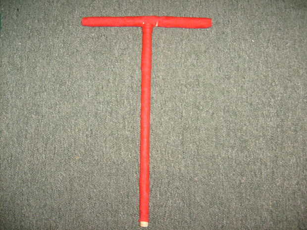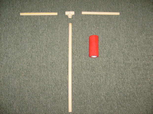 Usted necesitará dos de las secciones de tubería de ocho pulgadas, uno de los diecisiete pulgadas secciones, una de las conexiones en forma de T, el martillo y el abrigo del veterinario. Primero colocar las piezas como en la imagen y luego a martillo los tubos en la sección de T. Luego cubrir todo en veterinario envolver a su Ave algo suave Grip.