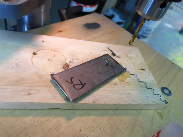 Siguiente agujeros fueron perforados para los pernos. Los agujeros fueron marcados hacia fuera en dos piezas interiores y fueron perforados hacia fuera demasiado. No voy de brocas más pequeño a más grande (recomendado) pero utilizo aceite de perforación.