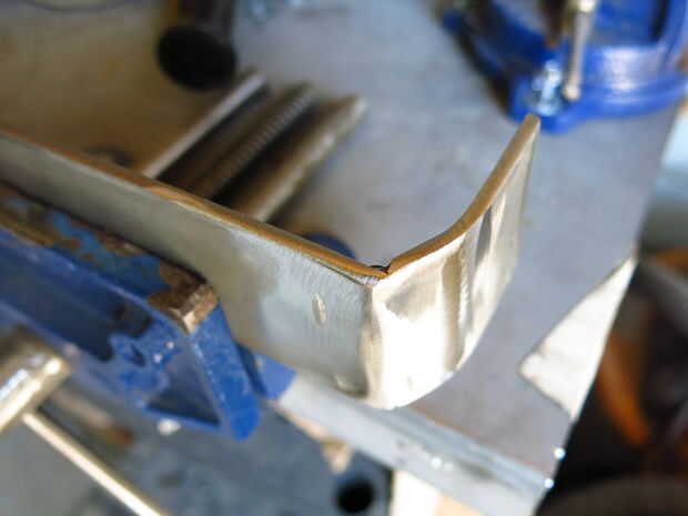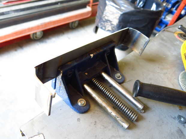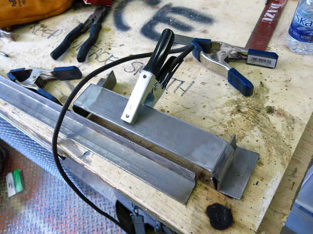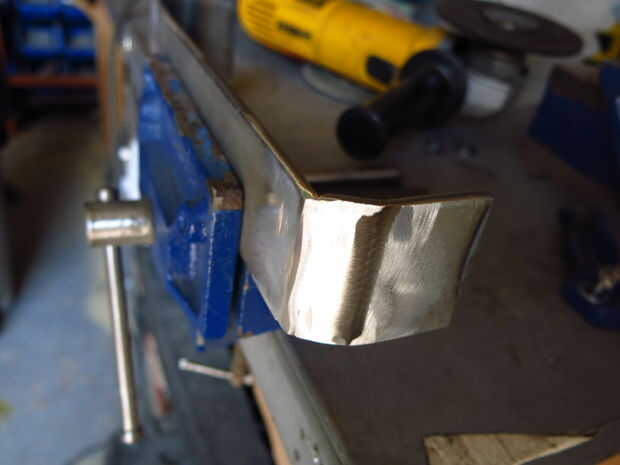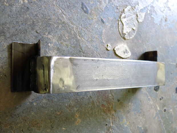 Martilló las piezas laterales en el vicio que tenía una leve curva y había soldada a la pieza más larga. Tierra de mi soldaduras borde feo y luego la pluma a un brillo agradable. A continuación, las piezas laterales fueron soldadas al hierro de ángulo (no soldar encima de la madera contrachapada; Lo hice porque me puse impaciente y no quería limpiar la mesa de soldadura).