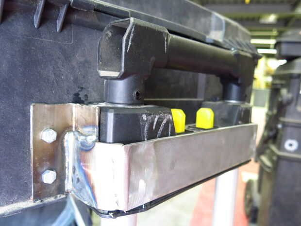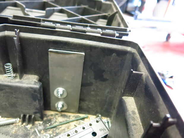 El soporte tiene martillado alrededor un poco hasta que otra vez, entonces taladró agujeros en el carro de la herramienta. Me intercala las placas y los tornillos por apretar con un controlador de impacto.