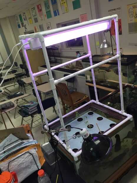 Los orificios perforados y un enrejado de hilo en el extremo de mis guisantes crezcan los cordones. Y toda la estructura en la parte superior del acuario.