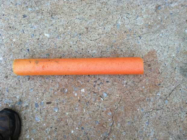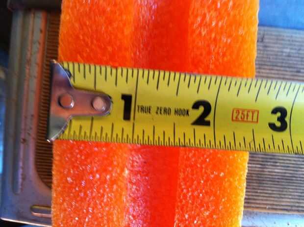Después de probar varios grosores y densidades de la espuma, surgió la idea de usar 1/2 de un juguete de piscina "fideos". La pieza que tenía era de 2.5" de diámetro. Utilicé un cortador de caja para esculpir el material de la espuma.