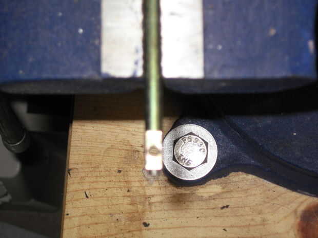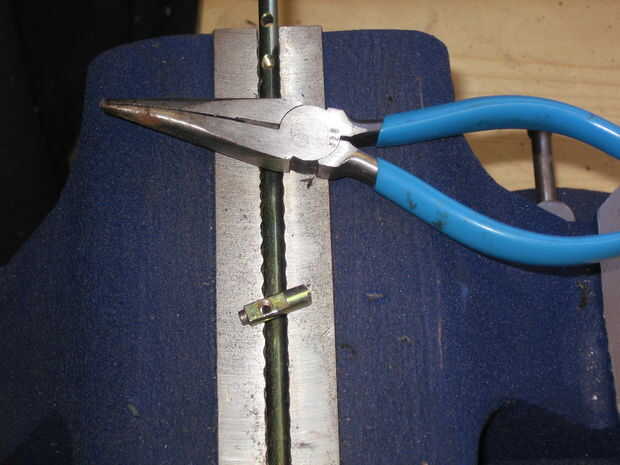Luego usé mi dremel para cortar la mayoría de la manera a través de la varilla de 3/4 de pulgada de la punta. Cortar de ambos lados dejando una delgada pieza de metal conexión final con el resto de la varilla. Luego usé un par de pinzas para romper el extremo de la varilla. (He encontrado que si corta completamente a través de la varilla de la pieza que quiero va volando a través del cuarto. Luego pasa más tiempo buscando la pieza que realmente se necesita para hacer el proyecto. O usted está tratando de llamar al 911 con una pieza de metal en el ojo.)