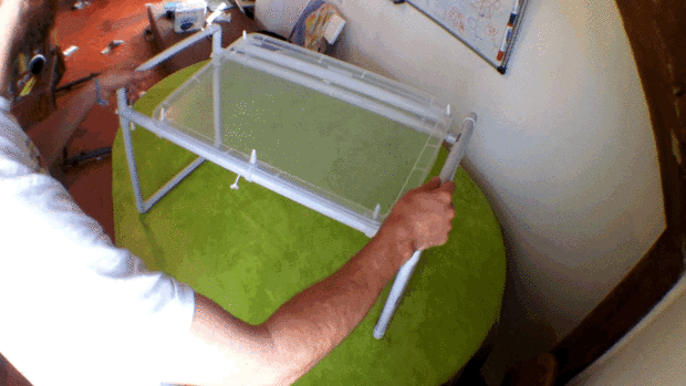El principio es simple, que tanto de las partes laterales están conectados a través de tubos de PVC más grandes (25mmØ) en que thiner tubos (20mmØ) (fijados a las piezas laterales) pueden resbalar.