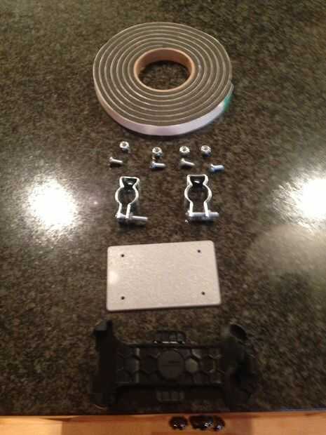 Pasemos al montaje de bicicleta real. Aquí está el producto terminado, sin el iPhone. (Ignore el cortacésped, que la moto se inclina contra).