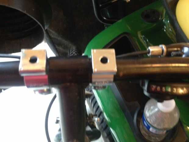 Marca de la placa en el borde donde alineen los agujeros de las abrazaderas. Se perforarán los orificios de montaje de la placa en la línea larga central de la placa. En mi caso, pude poner las abrazaderas duro contra la abrazadera del vástago. Que tenga a sus abrazaderas más.