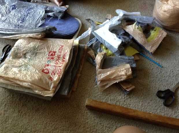 Primero tuve que cortar la parte inferior de las bolsas de las asas después que aplana la bolsa completamente en su forma original.