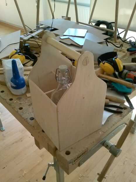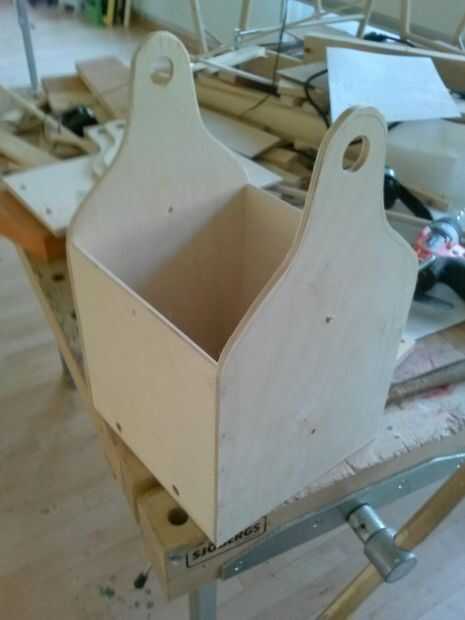 Las piezas se pegados y clavados usando ordinario cola blanca de madera y clavos pequeños 15-20 mm. La manija fue cortada en los extremos con un cuchillo y para asegurarlos corte una raja y utiliza una cuña para fijar en la madera contrachapada.