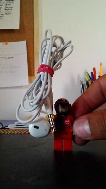 Que el cable que ha envuelto solo con la goma y colocar la parte metálica de los auriculares justo en frente de la persona de Lego y dar se un empuje hasta que oiga un clic y usted verlo está conectado a la mano