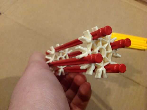 Esta parte puede hacer que los dedos puede ayudar lastimado, pero tener una superficie dura a la prensa contra. Coloque cuatro barras rojas en dos de las ruedas para que haya que un espacio en el disco entre cada barra y cada barra roja está conectado a dos ruedas blancas. Ayuda si haces esta una barra a la vez, conecta cada uno a ambas ruedas blanco antes de colocar la siguiente. Hacer más como éste. En cada uno, una rueda debe ser justo al final de las barras y el otro debe ser un poco más de una pulgada del extremo de las barras rojas, como en la foto.