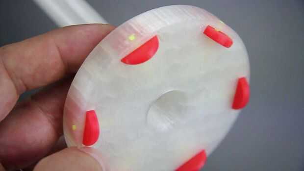 El eje de rotación tiene seis bolsillos en la parte inferior donde ruedas pequeñas residen y actúan como un cojinete de rodillos. Los ejes de las ruedas están hechos de filamentos estándar 1.75 m m.