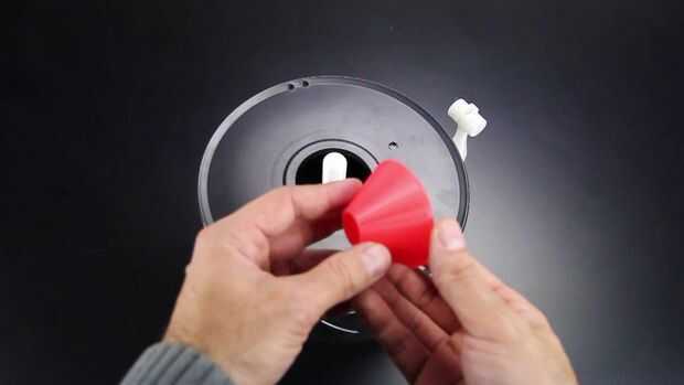 Coloque su carrete de filamento impresión 3D en el eje del husillo y colocarlo en su lugar deslizando el cono de fijación hacia abajo el eje del husillo. Asegúrese de apuntar la punta del cono hacia abajo.
