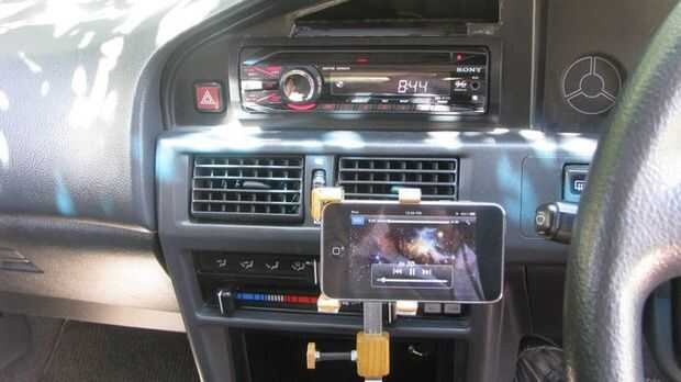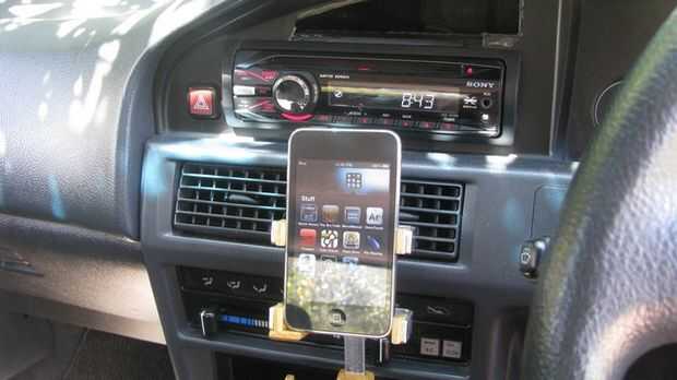 Titular también puede girar en dos ejes, lo que es conveniente para escuchar música o para un pasajero ver videos. IPod está enchufado en el estéreo en el conector de unidad de radio del coche.