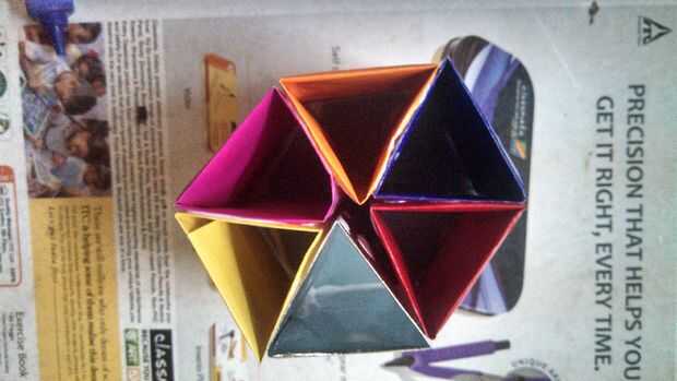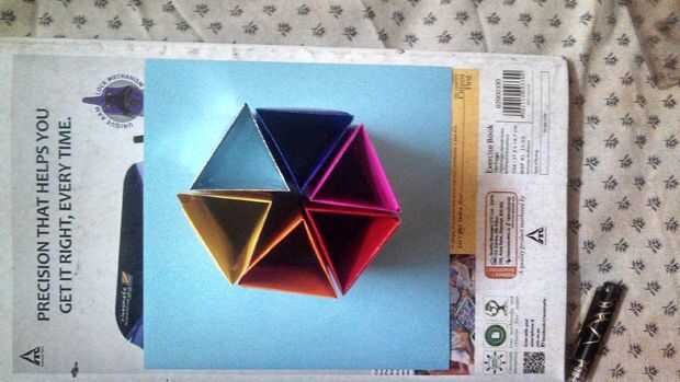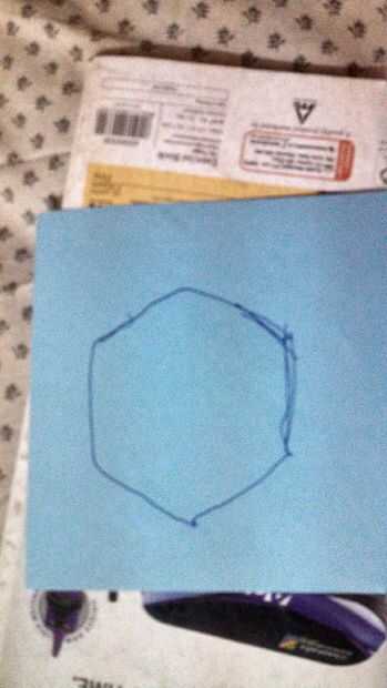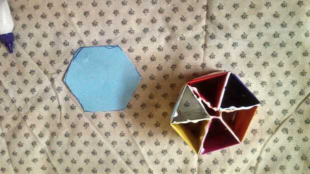 cuando todas las piezas son fijadas a toman otra hoja de papel y delinear el hexágono formado en el papel y cortar y luego pegar en el soporte (base de hexágono shaoe)