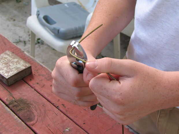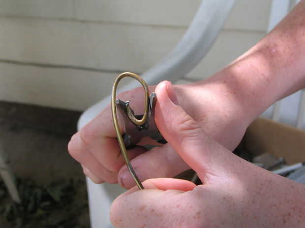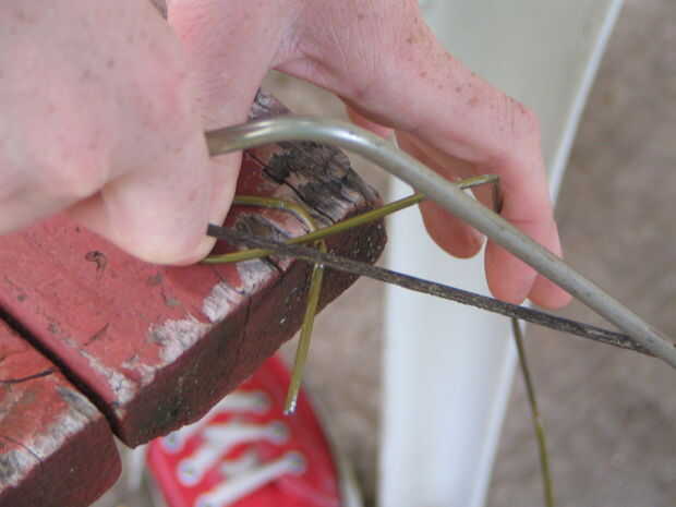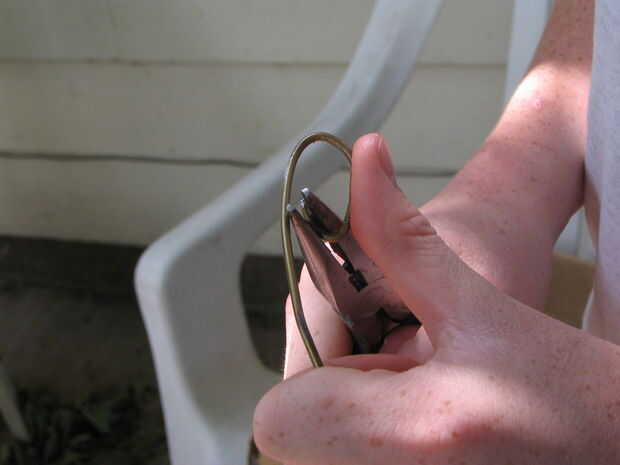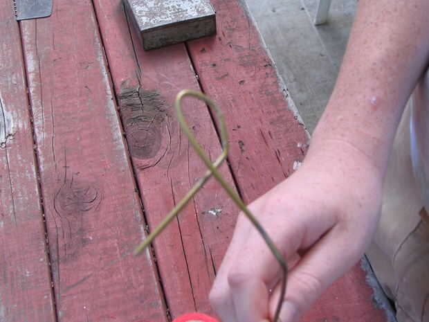 Ir al extremo opuesto (uno que estaba doblado antes paso 9) y con la pieza en forma de L en el suelo, asegúrese de que son paralelos a unos de otros. Doblar el alambre alrededor en un lazo, recorte el exceso y doble extremo por lo que no es fuerte. * Tenga en cuenta, el bucle no tiene por qué ser cerrado.
