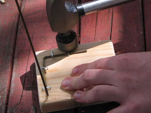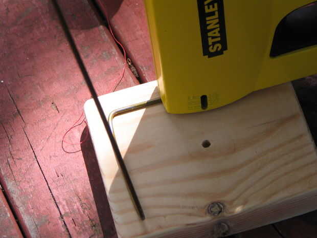 Básico "L" formada parte del alambre en madera cuadrada. Martillo de las grapas para que estén bien apretados. Te sugiero 4 grapas, 2 para cada parte de la "l".