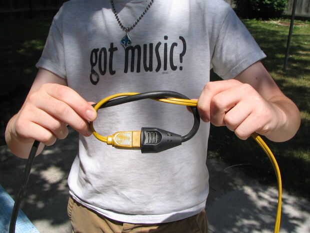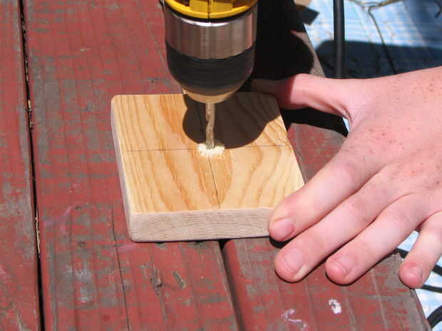 Encontrar una broca es del mismo tamaño que el pincho de bambú. Poner en el taladro y enchufe pulg., (he incluido una foto de la manera "segura" con un cable de extensión. Sólo un nudo de la Plaza y no apriete!!!) Perfore un agujero en el centro de la X (más o menos)