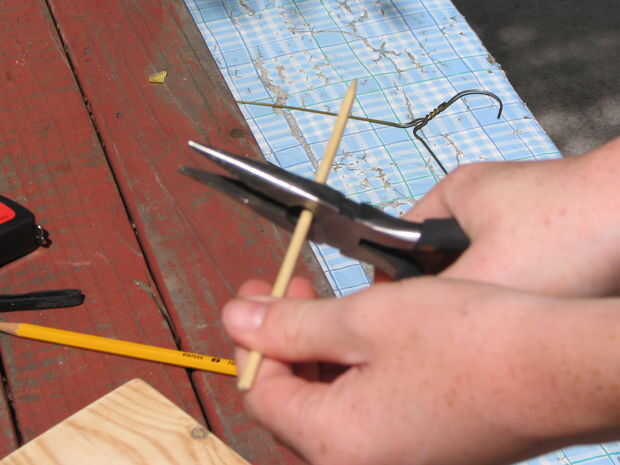 Asegúrese de que el pincho se ajusta en el agujero. Poner más pequeño carrete de hilo que se utilice en la broqueta y marque la altura sobre la brocheta. Luego corte en marca con arena y alicates de punta.