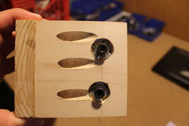 Antes de pegar la madera contrachapada juntos hacen Asegúrese de que usted instale las tuercas T, tomarán algunos martillazos. Utilicé un trozo de madera para proteger todo. Estas tuercas T permitir que el tornillo pase a través de la madera y si se aprietan en el acto de escritorio como una abrazadera para mantener todo en su lugar. Tuve que avellanar mina porque originalmente compré tornillos basados en madera gruesa de 1/2". Si compraste los pernos del tamaño correcto se sentaban justo por encima de la superficie de la madera.