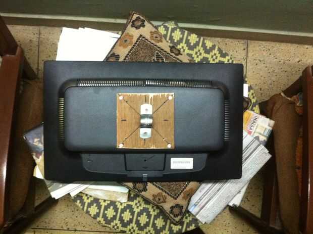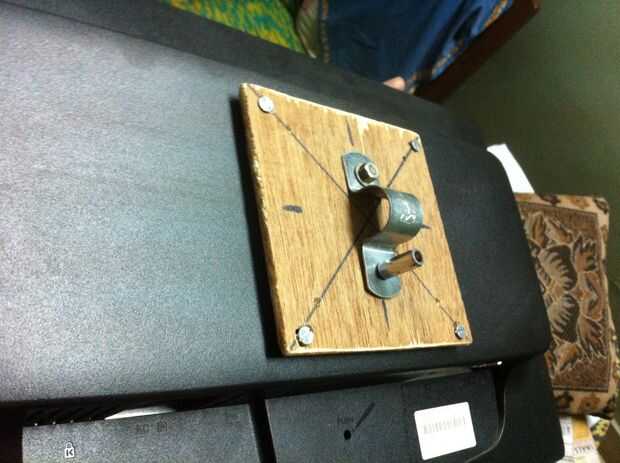 Utilicé una capa gruesa de 5mm y usando un taladro, fija los tornillos en la abrazadera metálica. Luego, en el reverso, he arreglado los tornillos que sujetan al monitor. en ambos, usé una tuerca y el otro un micrótomo para permitir el ajuste manual del ángulo del monitor.