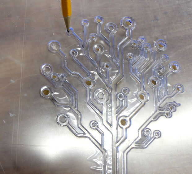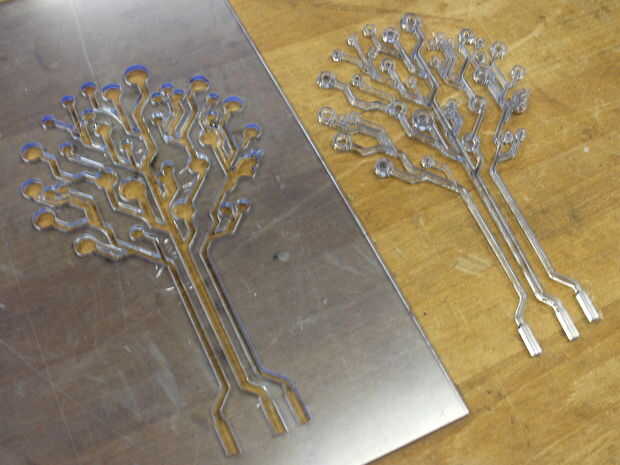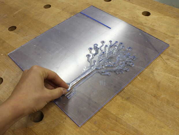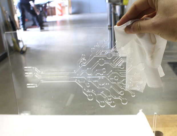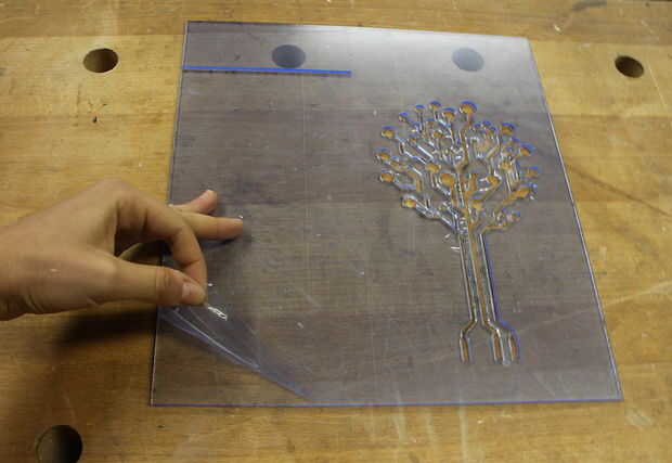 Cuidadosamente me quitan exceso de acrílico de la decoración. Fue útil aflojar el material extra con mis manos antes de meter a detalles más finos con un lápiz. He pelado lejos el material de protección en ambos lados de mis piezas y limpiar los bordes con un paño suave. Bordes limpios ayudan a acrílico piezas enlace mejor.