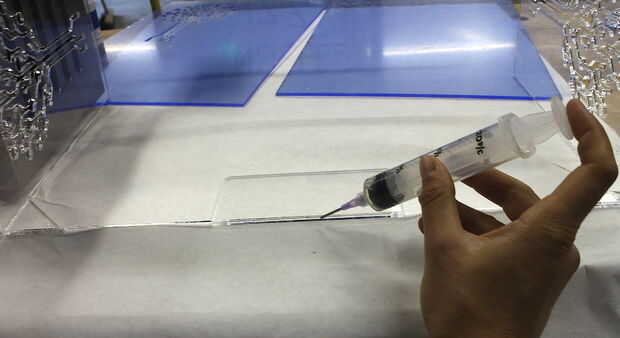 Había marcado el centro de las piezas de plataforma y gancho con un lápiz, alinear las dos marcas y las piezas pegadas. Asegúrese de que el gancho y piezas de soporte están en el mismo lado del soporte. Se trata de la parte posterior del soporte. También recomiendo deslizamiento extras piezas de acrílico en los dos extremos opuestos de su stand (como se muestra en la imagen aquí), por lo que el soporte no tambalearse mientras pegue.