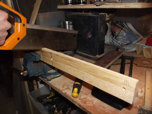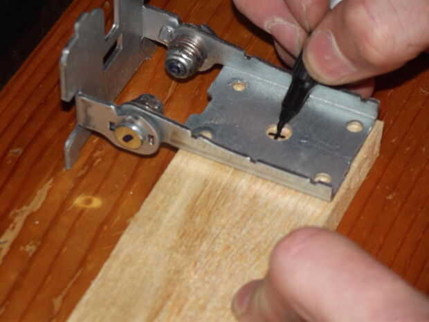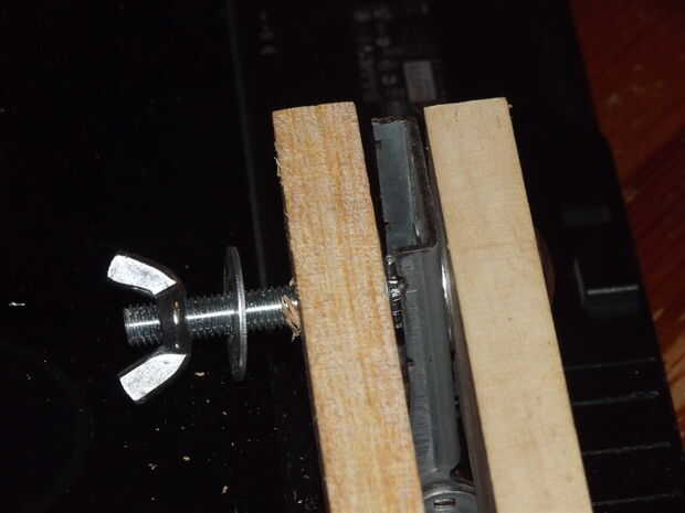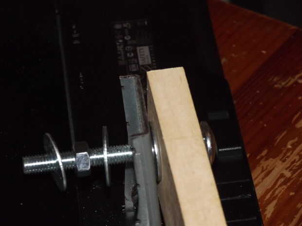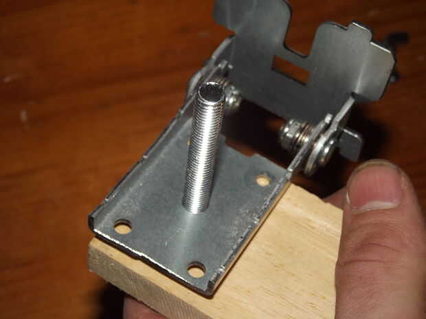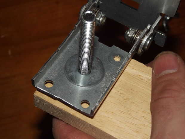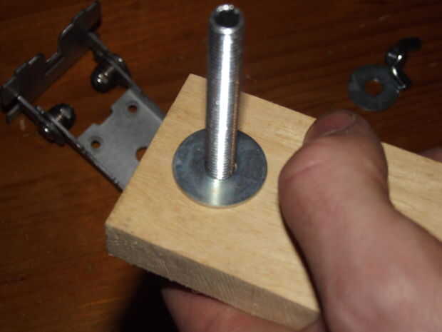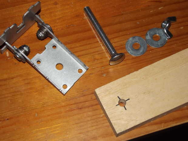 Colocar las piezas de la bisagra de madera para el soporte adaptado se hace en un cierto orden. El perno va en la madera con una arandela en la parte superior y soporte de metal se coloca sobre la lavadora con una tuerca para mantenerlo en su lugar. Apretando la tuerca puede presionar y apriete el tornillo en la madera de entrenador. Encima de la tuerca puse otra arandela y otra pieza de la bisagra con una arandela y finalmente una tuerca de mariposa para fijarla.