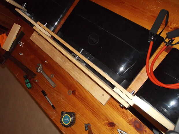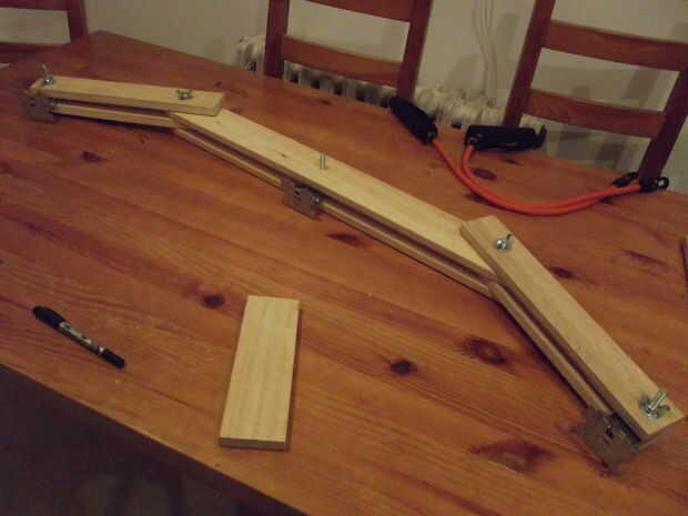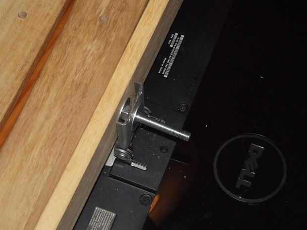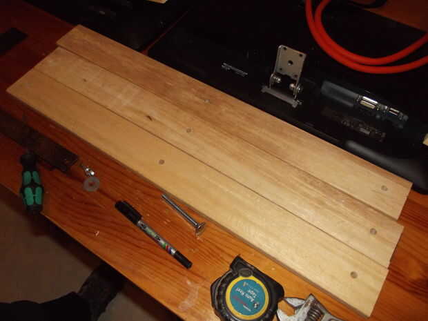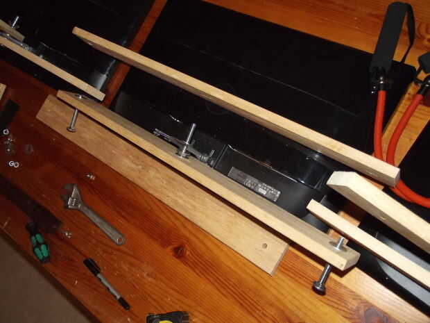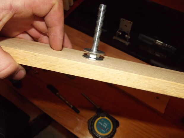 Como antes con los soportes laterales usé un perno de coche en la pieza del fondo con una arandela, una tuerca y luego el soporte. Después del paréntesis otra arandela y la última pieza de madera se atornilla en la parte superior con una arandela y una tuerca de mariposa. Se unen las bisagras del lado de la misma manera.