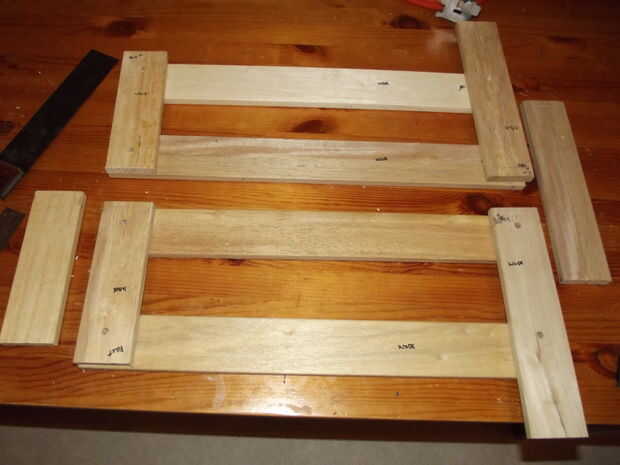 Hay 2 chasis compuesto por tres piezas de madera atornillada en forma de U, en la parte inferior atornillada a la mesa y en la parte superior para colgar el soporte para colgar con bisagras (este es el más largo a la derecha).