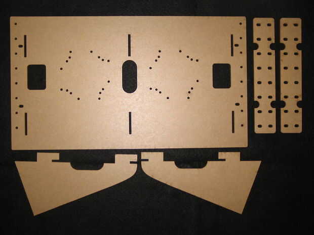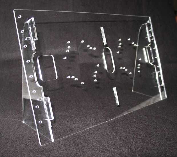 La idea del stand era el DMD montado en el frente y tener un lugar en la parte posterior para montar un Arduino Uno. La extraña disposición de agujeros entre los orificios de acceso y las ranuras de soporte son la Arduino Uno los agujeros de montaje. Hay cuatro conjuntos de orificios de montaje para el Arduino un ser montado hacia arriba, abajo, izquierda, o derecha. y puede ser montado en el lado de mano izquierda o mano derecha. Aunque supongo que será siempre estar a la izquierda (mirando desde atrás).