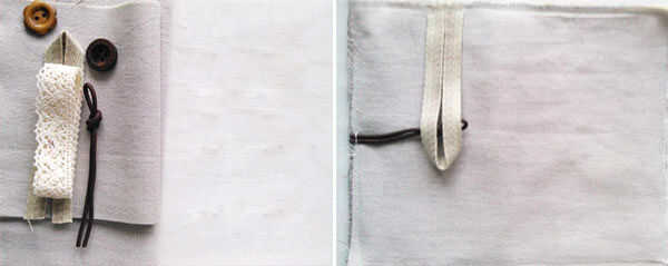 Preparar sobre materiales. Coser una tela de lino con 15,5 cm * 20 cm con la tela de la guarnición de puntada recta. Coser una cinta doblada espiga a los 5cm de un lado de la tela y un cordón de cuero doblada a 7.5cm de su lado del ángulo recto.
