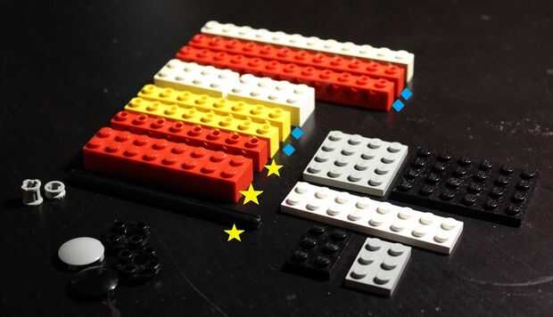 Las únicas partes que son esenciales son los marcan con estrellas (dos ladrillos deben tener la misma longitud) y la barra debe ser más largas que los ladrillos de 2 unidades. La longitud de los cuatro ladrillos marcados con diamantes azules no es crítica, pero deben tener agujeros.