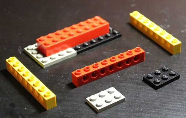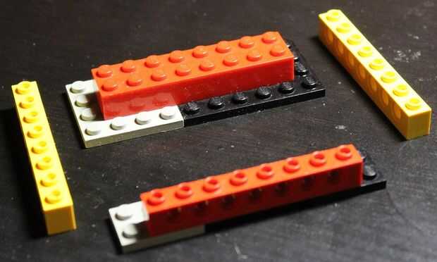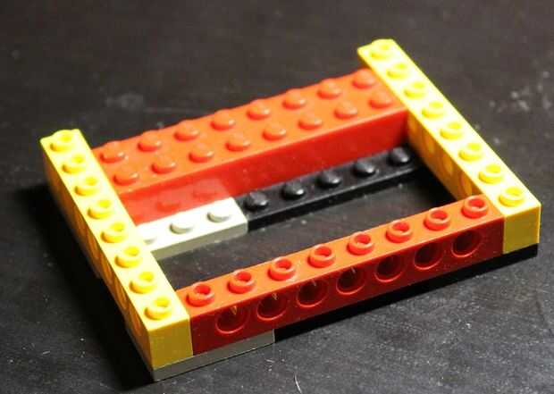 Armar la base usando los ladrillos delgados juntos sosteniendo la parte inferior. Aquí es donde deben usarse los dos ladrillos de la misma longitud, y los ladrillos a los lados deben tener agujeros.