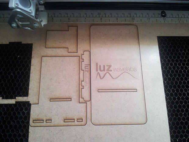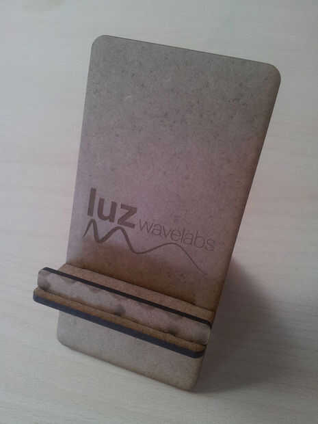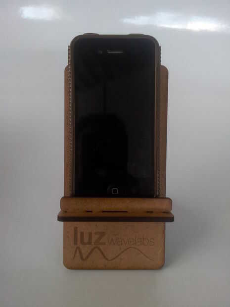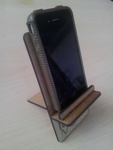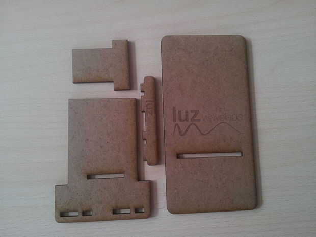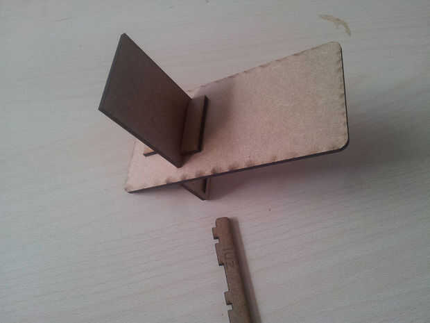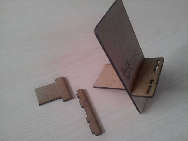 Entonces tendremos toda la pieza cortada (primera imagen). Sacaremos el trabajo de la laser y empezaremos el montaje de las piezas. No tienen mucha complicación, si seguís los pasos de las imágenes siguientes conseguiréis vuestro soporte para teléfono móvil.