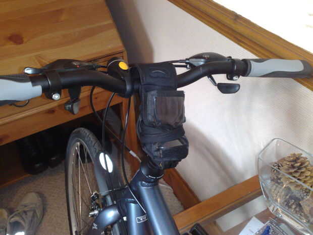 sólo envuélvalo alrededor de barra de mi madre y que tiene, compré el soporte mp3 en mi tienda de deportes local para un fiver, cabe bien y cómodamente sin problemas.