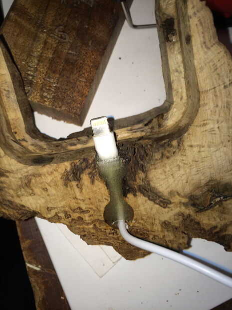 Que perforar un pasaje a través de la base para el cable puede pasar y averiguar cómo el cable saldrá el soporte con un mínimo roce. Desde el extremo del conector del relámpago del cable es menor que el adaptador USB, pase el cable a través de la base antes de pegarlas a la rebanada.