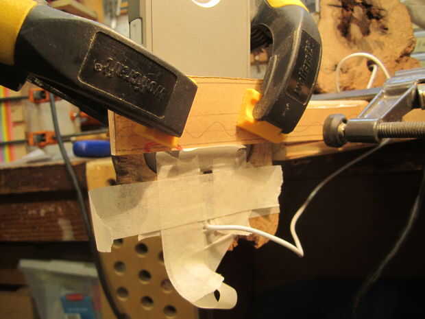 Pegue el cable en dos pasos. Coloque el teléfono en un ángulo y fijar el cable en su lugar con un poco de epoxy, luego coloque la rebanada vertical y completar el pegado, utilizando un montón de cinta adhesiva e inyección de goma cuidadosamente con una jeringa. Nadie quiere epoxy en el teléfono!