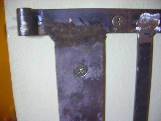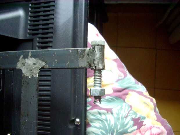 No he podido conseguir las bisagras de la medida adecuada, así que compré algunos más grandes y cortar con la amoladora. Mientras que atrás, pensé que era nada seguro para utilizarlas como estaban, enchufe tipo, porque en algunas circunstancias la televisión puede caer si movido con poco cuidado. Luego reemplacé los pernos originales suaves y corto para tornillos más largos, esto que me permita poner tuerca y chaveta. Me encanta los pasadores, tan simples y eficaces. Nota agregada al final.